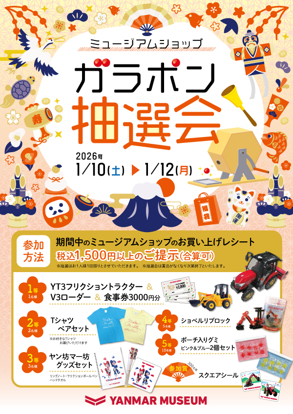 【開催期間】 2026年1月10日(土)~1月12日(月) ミュージアムショップのお買い上げレシート 税込1,500円以上のご提示(合算可)で抽選会に参加できます! ※抽選はお1人様1回限りとさせていただきます。 ※抽選会は賞品がなくなり次第終了といたします。 この機会にぜひ!ヤンマーミュージアムショップにお立ち寄りくださいませ🎍