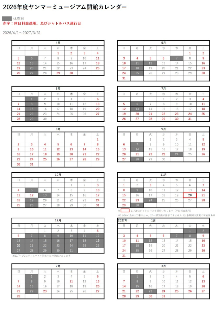 【2026年4月1日(水)~2027年3月31日(水)】ヤンマーミュージアム開館カレンダー及びシャトルバス運行日については下記ご参照をお願いします。