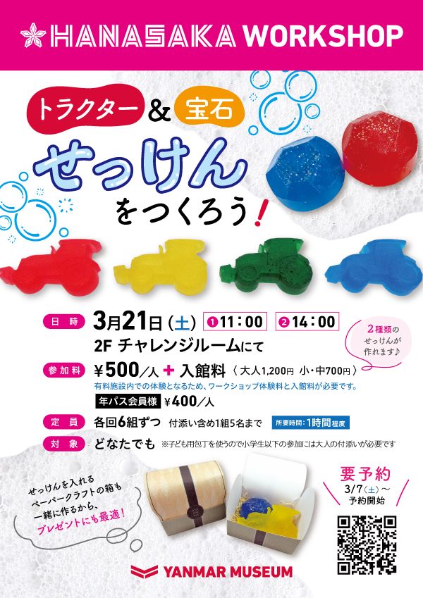 1人500円(WS体験料)+入館料(大人1,200円/小・中学生700円)※年パス会員の方は体験料1人400円 ■ワークショップに参加するには、WS体験料と入館料が必要です。 WS体験料は参加者1名あたりとなります。 付き添いの方(保護者)の別途体験料は発生しません。 ■参加者1名につき2種類のせっけんがつくれます。 (トラクター型せっけんと宝石せっけん) ■ご予約1組につき、付添含め5名様まで お申し込みいただけます。 ※付き添いの方も入館料として 大人1,200円、小中学生700円が必要です。(未就学児無料) ※ヤンマーミュージアムの入場予約については、 別途、お客様自身でweb予約をお願いいたします。 |
