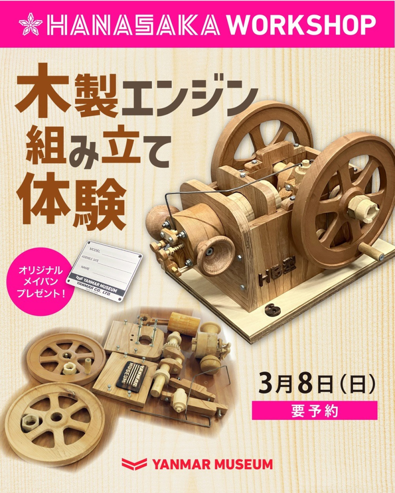 WS体験料【年パス会員】900円/人 【非年パス会員】1,000円/人 + 別途入館料 ・ワークショップ体験には、WS体験料と入館料が必要です。 ・お子様のみの体験はできません。16歳以上の保護者の付き添いをお願いいたします。 ・WS体験料は体験者1名あたりとなります。付き添いの方(保護者)の体験料は発生しません。 ・体験者1名につき木製エンジン1台となります。 ・ご予約1組様につき、体験者2名までお申し込みできます。体験者2名でご予約の場合は、当日受付窓口にて2名分のWS体験料をお支払いください。 ・お子様の体験者が2名の場合、付き添いの方(保護者)は1名でも体験いただけます。 ※付き添いの方も入館料として大人1,200円、小中学生700円が必要です。(未就学児無料) ※ヤンマーミュージアムの展示室見学については、別途、お客様自身でweb予約をお願い致します。 |